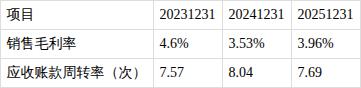 ?销售毛利率增长,应收账款周转率下降。报告期内,销售毛利率由去年同期3.53%增长至3.96%,应收账款周转率由去年同期8.04次下降至7.69次。