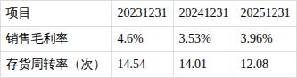 ?销售毛利率增长,存货周转率下降。报告期内,销售毛利率由去年同期3.53%增长至3.96%,存货周转率由去年同期14.01次下降至12.08次。