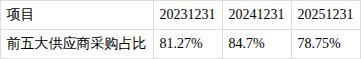 ?前五大供应商采购占比较大。报告期内,前五大供应商采购额/采购总额比值为78.75%,警惕供应商过度依赖风险。