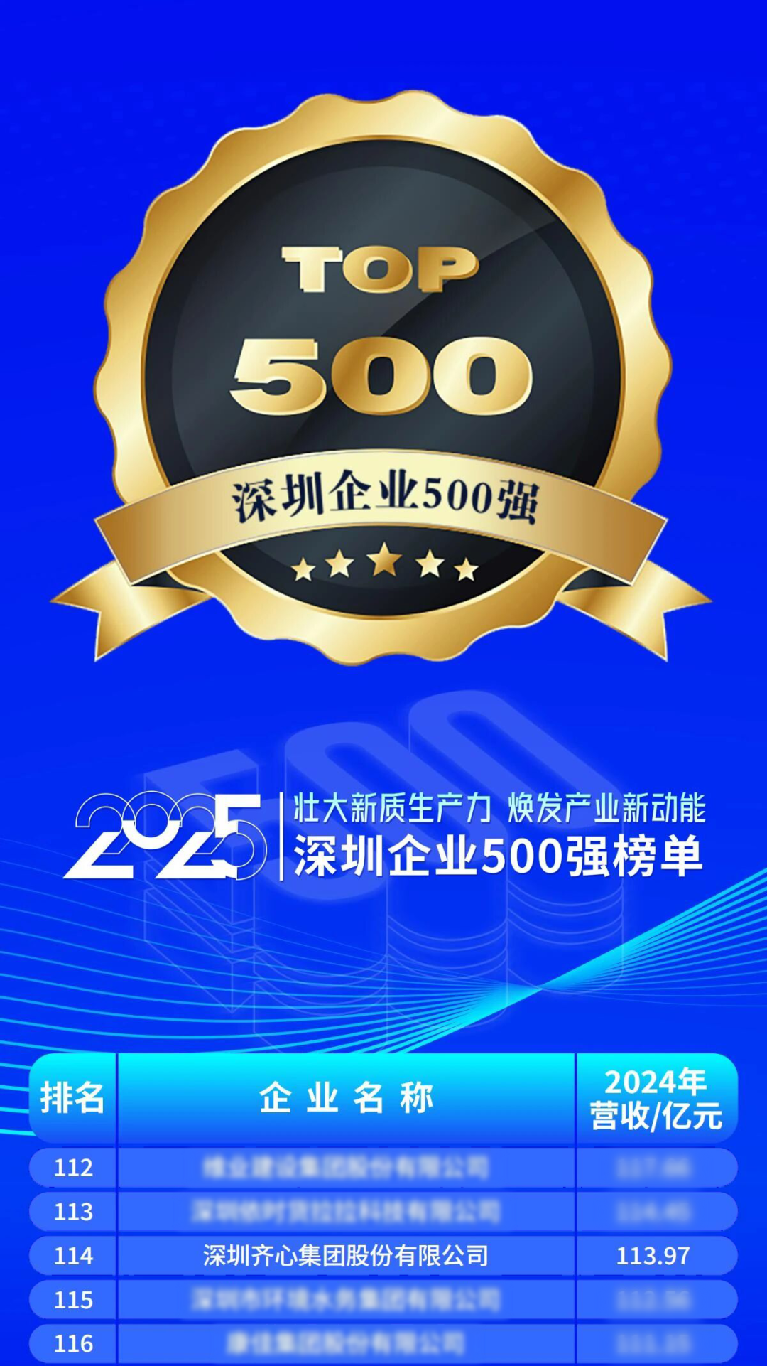 “2025深圳企业500强榜单”以企业2024年度营业收入为排序基准,平安、华为、比亚迪位列榜单前三名。齐心集团2024年营业收入113.97亿元,再度上榜,位列第114名!