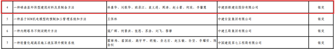 近日,经项目申报、形式审查、两轮专家评审、公示后,2023年度中建集团科学技术奖获奖名单火热出炉。中建西部建设的一项发明成果《一种磷渣基环保胶凝材料及其制备方法》荣获中建集团技术发明奖银奖。这也是中建西部建设首次获得该项荣誉。