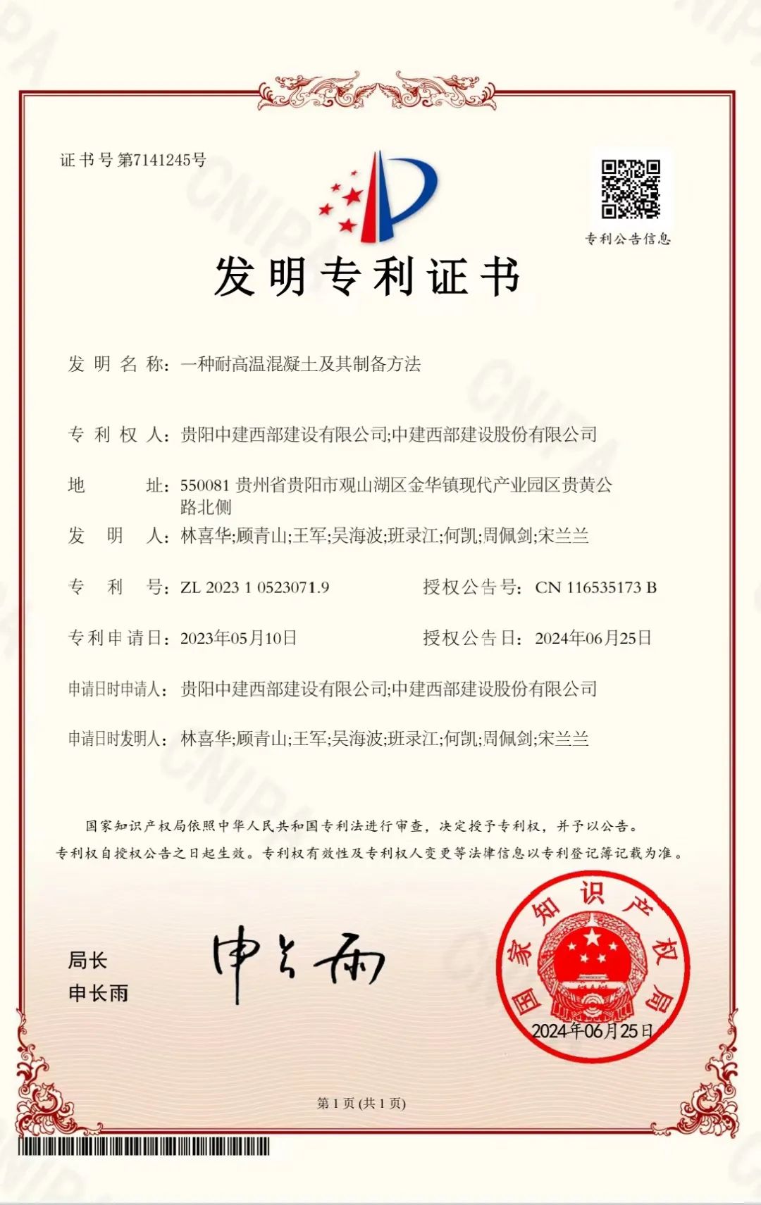 近日,中建西部建设所属中建商砼、四公司申报的2项科技成果获国家发明专利授权。