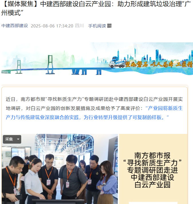 近日,在广州举行的“责任中国ESG年度盛典”上,中建环保建材(下称中建西部建设白云产业园或白云产业园)凭借其创新的“建筑垃圾-再生建材-绿色建造”产业闭环,成功入选“2025责任中国ESG创新案例”。这一权威认可,既是对园区在循环经济领域深耕实践的高度肯定,更是对其以“数智赋能、低碳运营”为核心,将ESG理念深度融入发展战略,响应“双碳”目标、培育新质生产力的最佳印证。