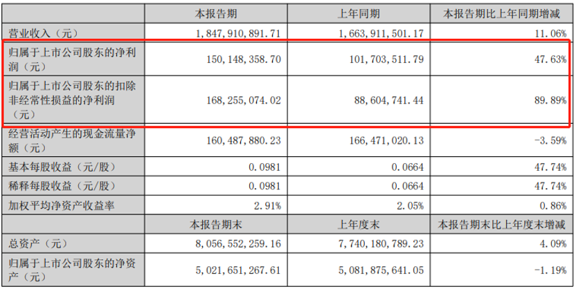 财报显示,2024年上半年,公司实现营业收入184,791.09万元,同比上升11.06%;营业成本132,462.18万元,同比上升3.00%;归属于上市公司股东的净利润15,014.84万元,同比增长47.63%;扣除非经常性损益后的归属于上市公司股东的净利润16,825.5万元,同比增长89.89%。