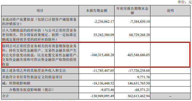 对于增收不增利这一现状,财报的非经常性损益项目和金额明细显示,除同公司正常经营业务相关的有效套期保值业务外,持有交易性金融资产、交易性金融负债产生的公允价值变动损益,以及处置交易性金融资产、交易性金融负债和可供出售金融资产取得的投资收益为-1.6亿元。