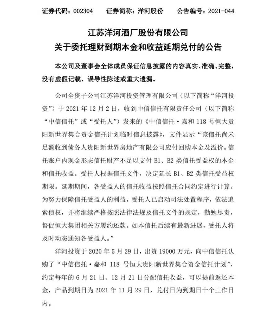 12月4日洋河股份公告称,去年9月,洋河出资1.9亿元,认购了投向中国恒大贵阳一项目的信托产品。洋河股份想着恒大集团的利息,而恒却在盘算着洋河股份的本金:公告称,上述信托产品拖欠本金7251万元,未收到的利息9500万元,两者相加共计1.67亿元。