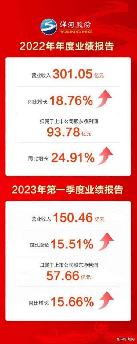 4月25日晚间,洋河股份发布2022年年报,公司全年实现营收301.05亿元,同比增长18.76%;实现净利润93.78亿元,同比增长24.91%。同步发布的2023年一季度报显示,一季度实现营收150.46亿元,同比增长15.51%;实现净利润57.66亿元,同比增长15.66%。