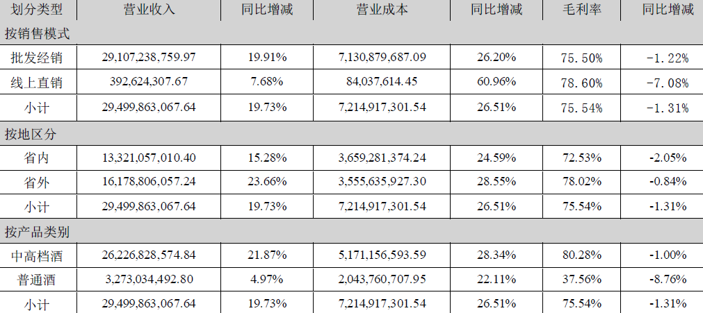 产品方面,洋河股份产品分为梦之蓝、苏酒、天之蓝、珍宝坊、海之蓝、洋河大曲、双沟大曲、贵酒、星得斯红酒等。报告期内,以梦之蓝手工班、梦之蓝M9、梦之蓝M6+、梦之蓝水晶版为代表的中高档产品共实现营收262.27亿元,同比增加21.87%;以洋河大曲、双沟大曲为代表的的普通产品共实现营收32.73亿元,同比增加4.97%。