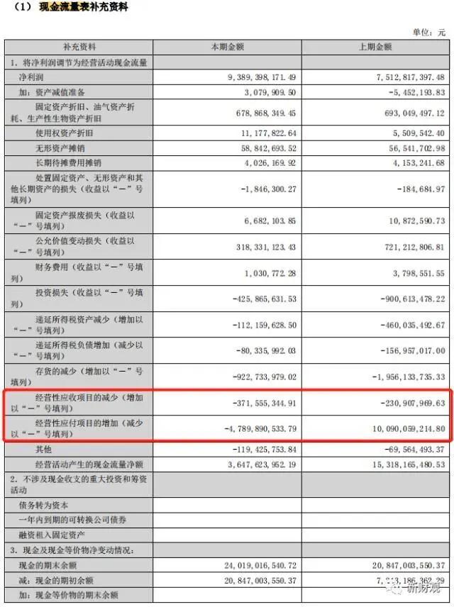 再结合2022年报附注中的现金流表补充资料,2021年经营性应付项目的增加109亿元,同期,经营性应收账款项目的减少-2.3亿元。