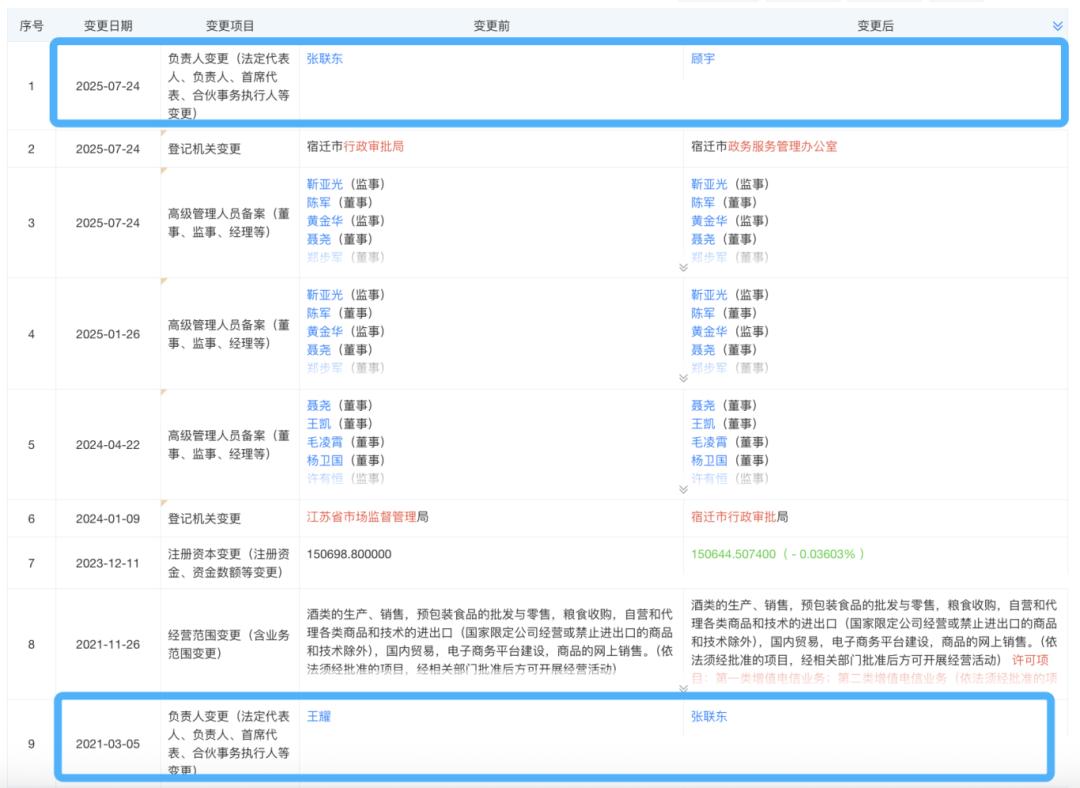 天眼查数据显示,2021年3月,洋河股份管理层发生了变更,时任宿迁市政府副秘书长、洋河新区党工委书记“空降”洋河股份的张联东“空降”洋河股份,接任党委书记、董事长、法人。