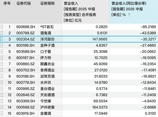 放到行业整体来看,洋河上半年的收入下滑幅度,只稍好于*ST岩石(维权)、酒鬼酒两家。而这两家公司不仅规模小,还都处于深度调整期。