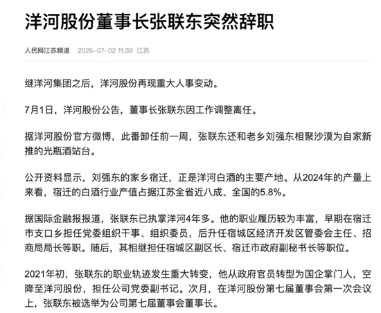 7月1日晚,洋河股份公告,董事长张联东因工作调整,申请辞职。