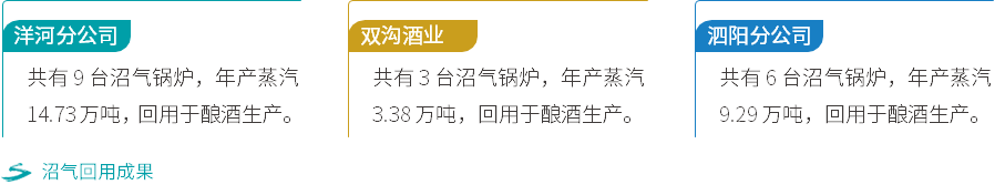 案例:优化处理工艺,实现污泥减量2024年度,泗阳分公司进一步优化废弃物处理工艺流程,研究制定《生物触媒项目标准化运行方案》《好氧区全覆盖实施方案》,扩大项目实施范围,实现好氧区全覆盖,分析数据进而精准把控吨水产泥量、药剂量及电耗量变化关系,实现污泥减量率达22.94%。循环经济对生产运营中所使用的资源及产生的废弃物进行循环再利用,不仅可降低对环境的负面影响,还可为公司带来潜在的经济效益。洋河股份重视产品生产工艺过程余热余压资源的回收利用及固废物资的回收利用等工作,通过污水处理中沼气回收与利用、酒糟处置循环利用、露天酒罐喷淋用水循环利用等循环经济项目,建立白酒酿造资源循环化模式。案例:建设沼气锅炉,回收污水处理沼气洋河股份各生产基地建有沼气锅炉,将废水厌氧过程中产生的沼气经沼气锅炉燃烧产生绿色蒸汽,重新回用于生产之中。沼气中含有甲烷、一氧化碳的气体,不能向大气中直接排放,而经过沼气锅炉处理后可带来明显的碳减排效果,在环保的同时,实现循环经济效益。