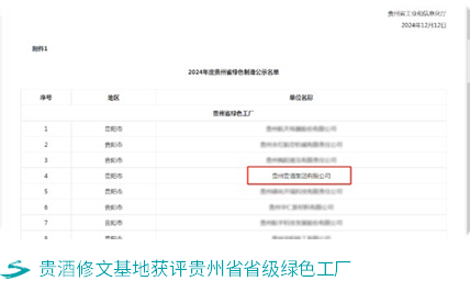 案例:贵酒修文基地成功获评省级绿色工厂贵酒修文基地于2024年成功获评贵州省省级绿色工厂。贵酒修文基地坚持“用地集约化、原料无害化、生产洁净化、废物资源化、能源低碳化”的清洁生产理念,每年开展环境因素识别与评价,在产品设计、资源综合利用、污染治理、节能减排等方面推动绿色发展。2024年,废弃物综合利用率达100%,单位产品综合能耗和单位产品碳排放量均达到行业领先。