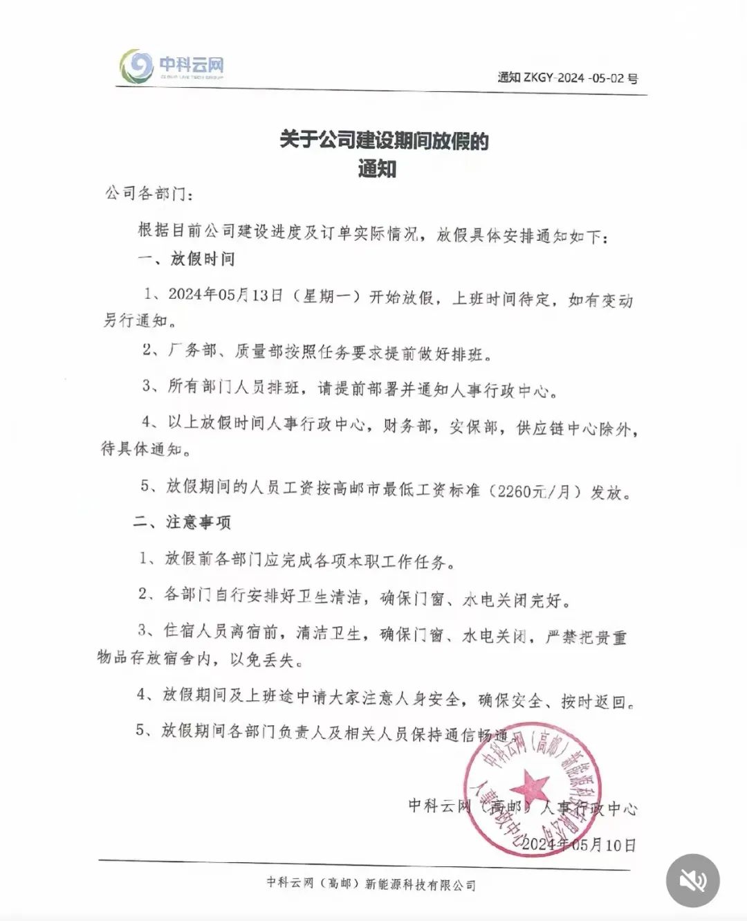 《放假通知》则指出,根据公司的建设进度及订单实际情况,除了人事行政中心、财务部、安保部和供应链中心外,公司于5月13日开始放假,上班时间待定。放假期间的人员工资按照高邮市最低工资标准(2260元/月)发放。