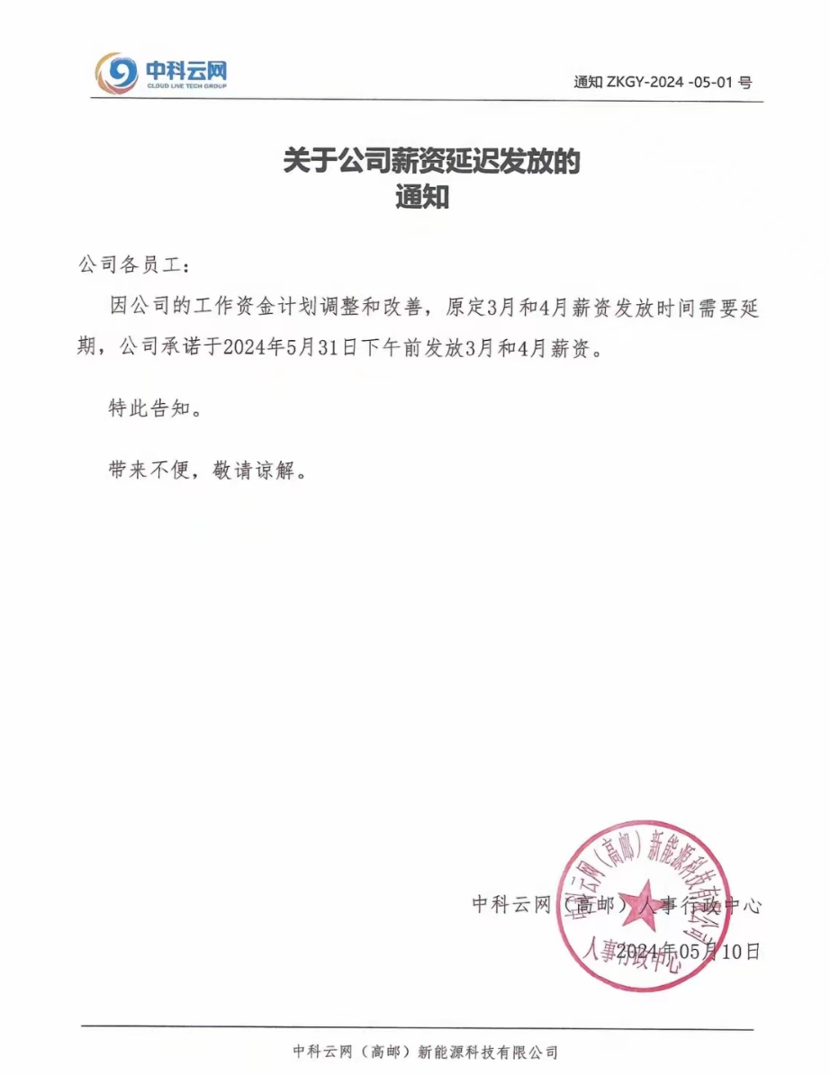 上述延迟发放薪资的通知中指出,因公司的工作资金计划调整和改善,原定3月和4月薪资发放时间需要延期,公司承诺于5月31日下午前发放。