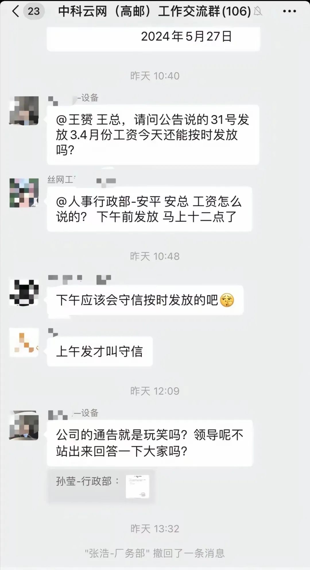 证券时报·e公司记者注意到,近日,有网友通过社交平台发布了中科云网(高邮)新能源科技有限公司(下称“中科高邮”)拖欠员工工资并放假的消息。