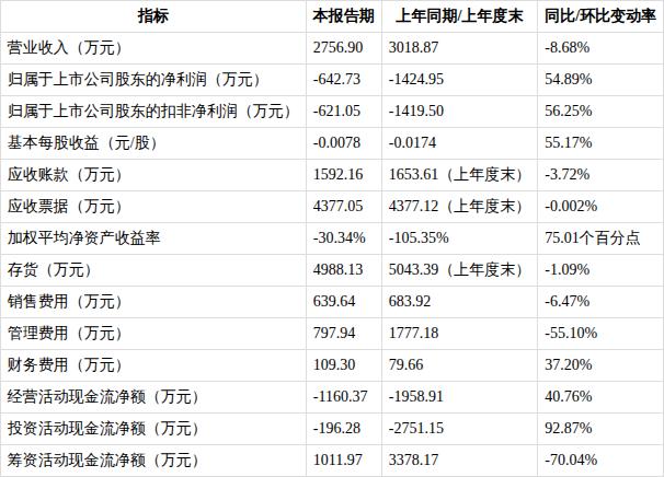本报告期内,公司归属于上市公司股东的净利润为-642.73万元,上年同期为-1424.95万元,同比减亏54.89%;合并报表层面净利润为-860.22万元,上年同期为-1872.92万元,亏损规模大幅收窄。