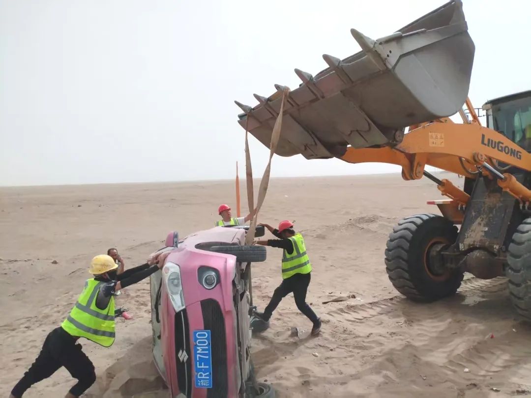 事发当日,一辆汽车不慎驶入松软沙地导致车身倾翻,危急时刻,正在执行日常巡查任务的北新路桥集团兵团交建公司昆墨一标安全员第一时间发现了这起突发事故。项目安全负责人王明海和同事毫不犹豫冲向事故现场,在四十度高温的荒漠中展开了一场与时间赛跑的紧急救援。