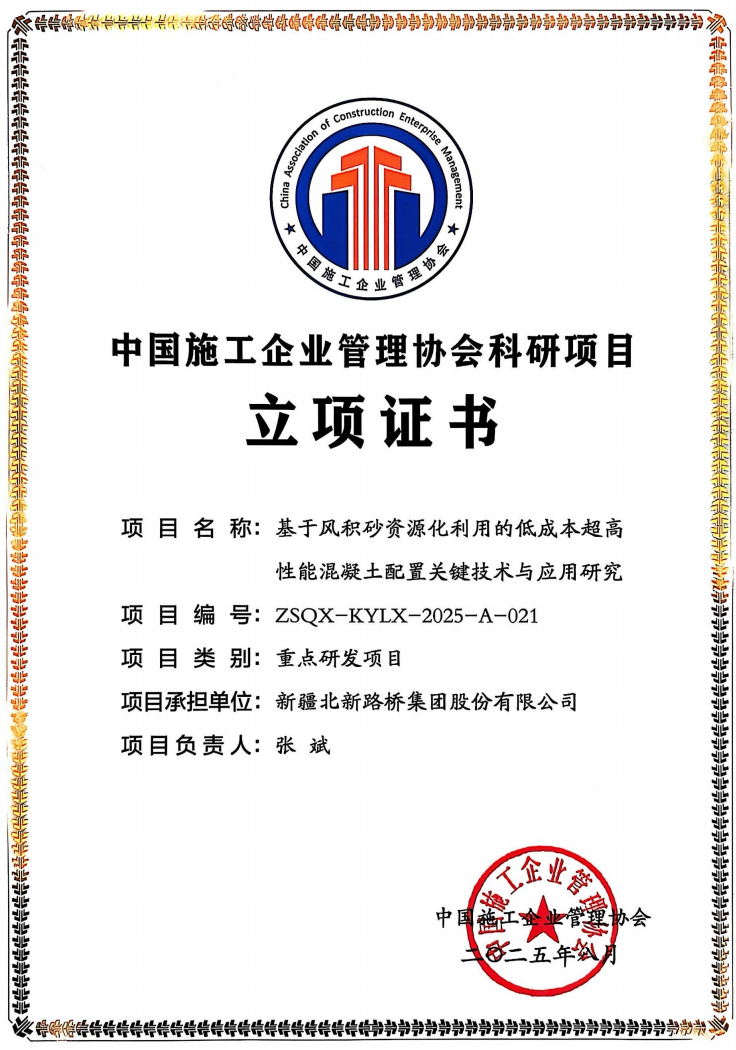 近日,北新路桥集团收到中国施工企业管理协会的立项通知书,正式启动“基于风积沙资源化利用的低成本超高性能混凝土(UHPC)配置关键技术研究与工程应用”课题研究。这一立项不仅是对公司科研实力的认可,更标志着北新路桥集团在科技创新领域迈出了重要一步。