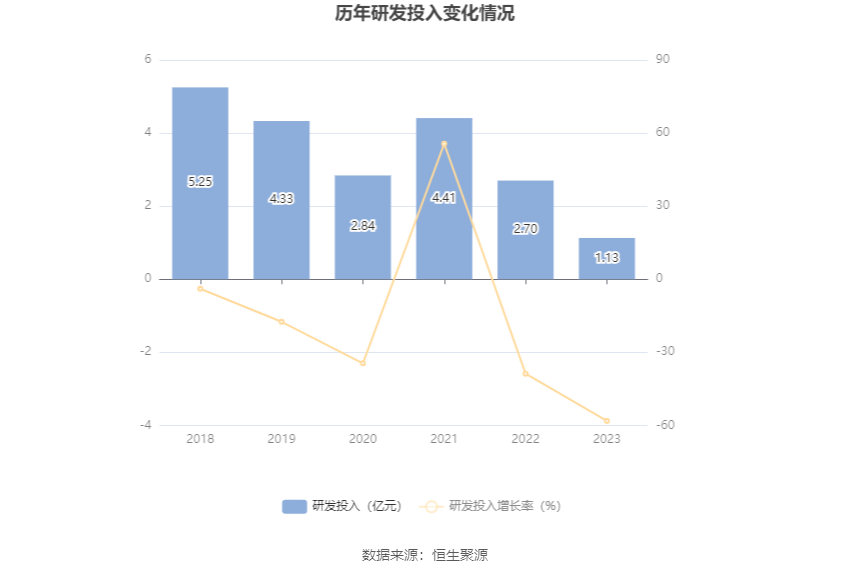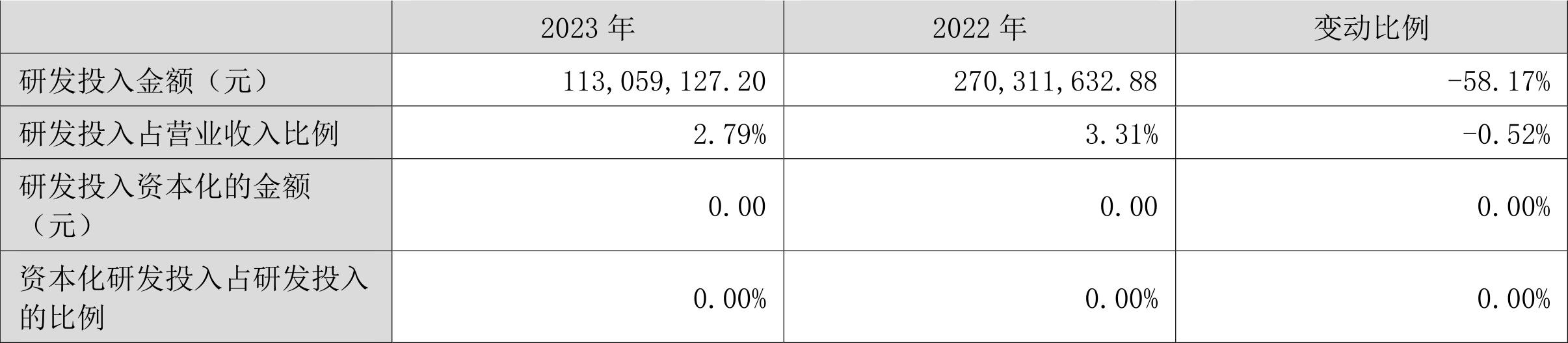 2023年全年,公司研发投入金额为1.13亿元,同比下降58.17%;研发投入占营业收入比例为2.79%,相比上年同期下降0.52个百分点。此外,公司全年研发投入资本化率为0。