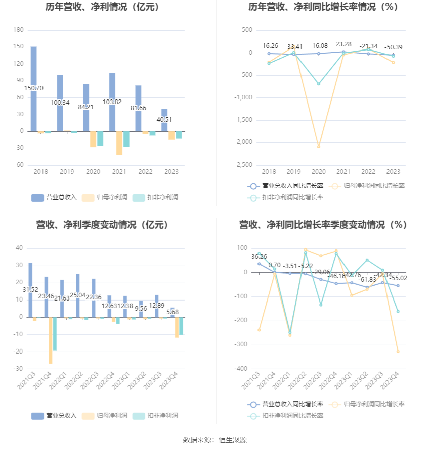 2023年,公司毛利率为13.61%,同比上升5.04个百分点;净利率为-36.99%,较上年同期下降31.11个百分点。从单季度指标来看,2023年第四季度公司毛利率为12.07%,同比上升10.97个百分点,环比下降4.53个百分点;净利率为-209.24%,较上年同期下降187.12个百分点,较上一季度下降203.77个百分点。