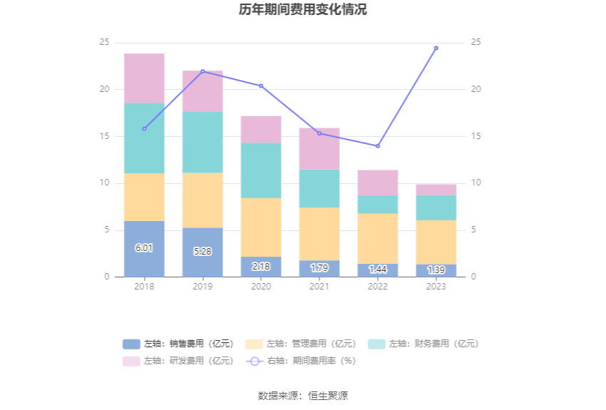 2023年,公司期间费用为9.90亿元,较上年同期减少1.52亿元;但期间费用率为24.44%,较上年同期上升10.45个百分点。其中,销售费用同比下降3.85%,管理费用同比下降12.18%,研发费用同比下降58.17%,财务费用同比增长38.68%。