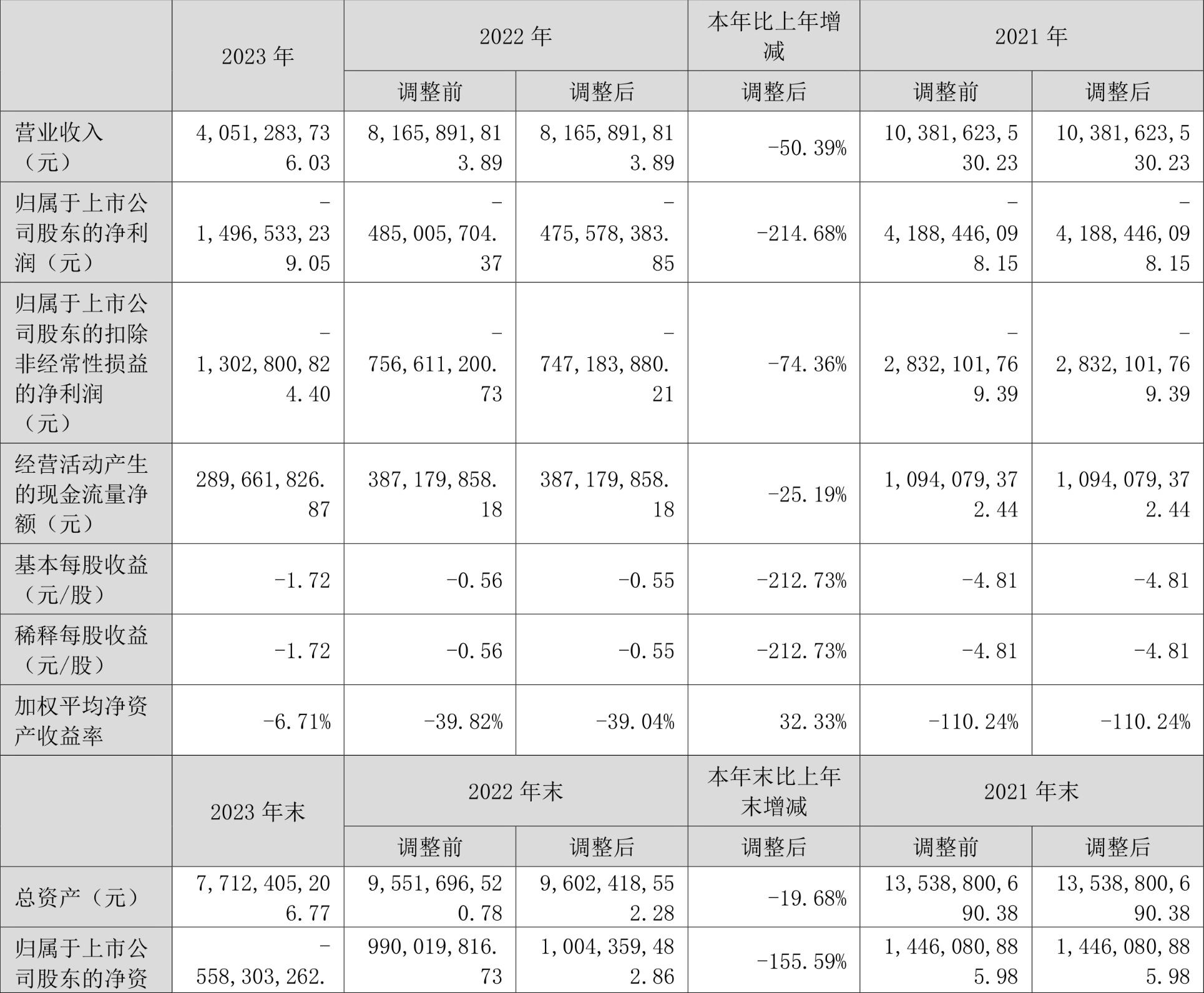 ST中利(002309)4月24日披露2023年年度报告。2023年,公司实现营业收入40.51亿元,同比下降50.39%;归母净利润亏损14.97亿元,上年同期亏损4.76亿元;扣非净利润亏损13.03亿元,上年同期亏损7.47亿元;经营活动产生的现金流量净额为2.9亿元,同比下降25.19%;报告期内,ST中利基本每股收益为-1.72元。