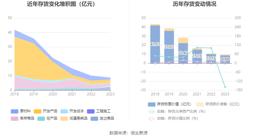 从存货变动来看,截至2023年年末,公司存货账面价值为8.84亿元,占净资产的-158.32%,较上年末减少1.32亿元。其中,存货跌价准备为7948.49万元,计提比例为8.25%。