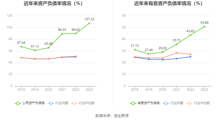 在偿债能力方面,公司2023年年末资产负债率为107.32%,相比上年末上升17.69个百分点;有息资产负债率为50.88%,相比上年末上升7.26个百分点。
