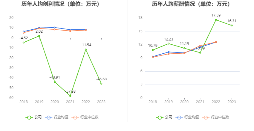 截至2023年末,公司员工总数为3276人,人均创收123.67万元,人均创利-45.68万元,人均薪酬16.31万元,较上年同期分别下降37.59%、295.84%、7.28%。