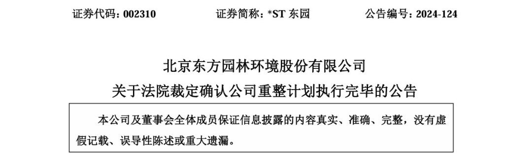 2024年12月30日,经北京市第一中级人民法院裁定,确认东方园林重整计划执行完毕。