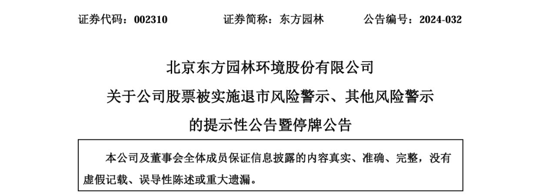 国资接手后,虽然也进行过好几拨输血,仍难以从根本上扭转局面。直到2024年4月,东方园林因净资产为负等原因,被实施“退市风险警示”,变成了“*ST东园”。