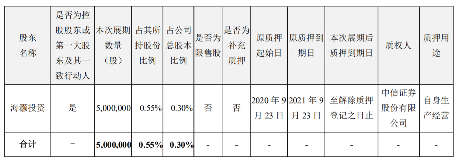 9月24日,广东海大集团股份有限公司(以下简称“海大集团”)发布了关于控股股东部分股份质押展期的公告。