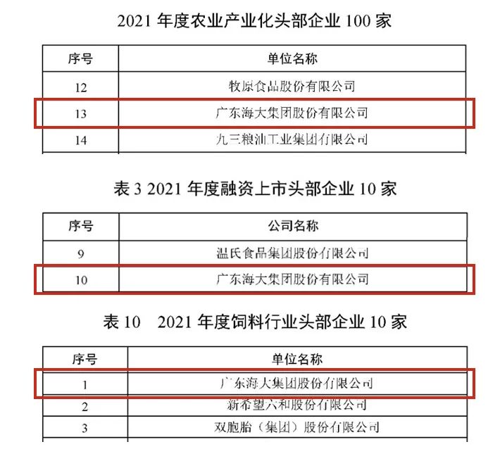 近日,中国农业产业化龙头企业协会公示2021年度农业产业化头部龙头企业100家名单。海大集团凭借领先行业的实力再度上榜,位列第十三位;并荣登2021年度饲料行业头部企业与融资上市头部企业榜单,分别位列第一、第十位。