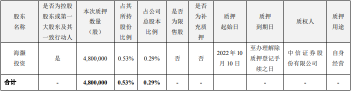 海灏投资本次质押数量为480.00万股,占其所持股份比例0.53%,占公司总股本比例0.29%,质押起始日为2022年10月10日,质押用途为自身经营。