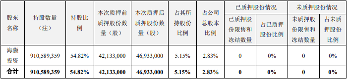 本次质押后,海灏投资质押股份数量为4693.30万股,占其所持股份比例5.15%,占公司总股本比例2.83%。