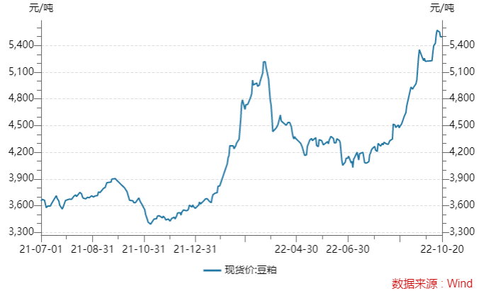 Wind数据显示,豆粕现货价格经历了上半年的冲高回落后,近期迎来了新一轮冲高。2022年10月14日,豆粕现货价格报价5570.86元/吨,已突破3月份的最高值5222.00元/吨,再创历史新高。