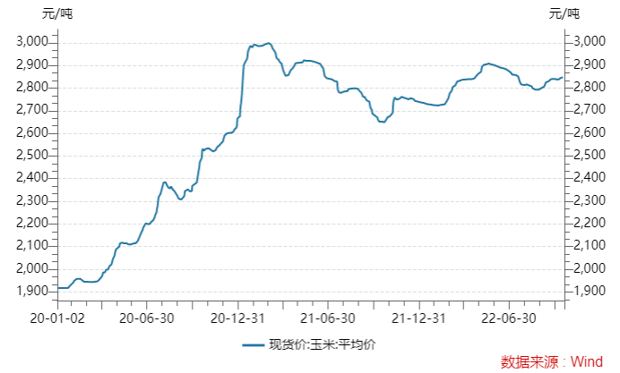 与此同时,玉米价格一直处于高位。Wind数据显示,玉米现货最新价格2847.37元/吨,而2016年3月至2020年初,玉米现货价一直处于2000元/吨之下。
