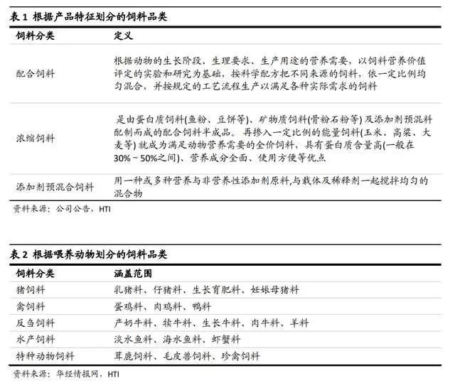 根据产品特征划分,饲料分为配合饲料、浓缩饲料、添加剂预混合饲料;按喂养动物种类划分,则可分为猪饲料、禽饲料、反刍饲料、水产饲料、特种动物饲料。