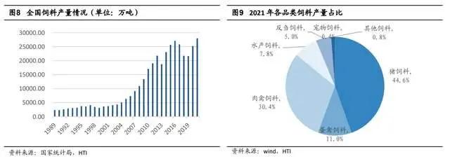 市场规模:根据国家统计局数据显示,1989-2021 年,全国饲料产量从 2365 万吨上升至 27997 万吨。自 2011 年以来,随着畜牧养殖行业的整体提升,饲料行业进入稳步提升的阶段,虽然 2018 年开始出现的非洲猪瘟影响了短期行业整体的需求量,但 2011-2021 年期间整体保持了较为稳健的增长,对应 CAGR 为 3.9%。