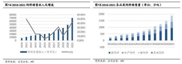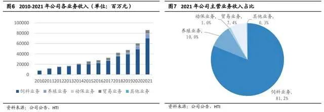 公司主营业务是饲料和养殖,2021 年公司饲料业务销售收入 698.3 亿元,同比增长 43.2%,收入占比 81.2%;2021 年养殖销售收入 86.3 亿元,同比增长 35.5%,占公司主营业务收入 10.0%。