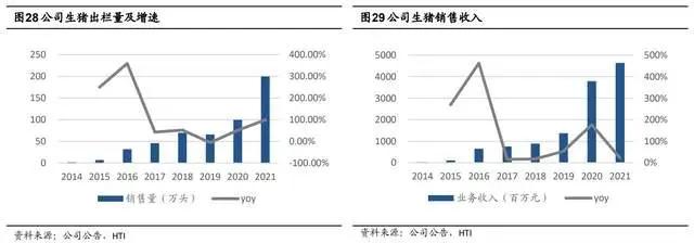 营收方面,从 2016 年的 6.5 亿元,增长到 2021 年的 46.4 亿元,CAGR 达到了 48.0%;生猪出栏量从 2016 年的 30 万头,增长到 2021 年的 200 万头,CAGR 达到 46.1%。