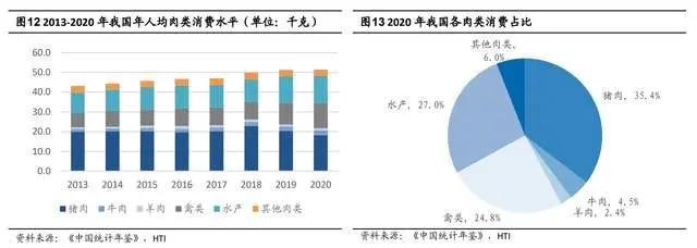 2020 年我国人均肉类消费为 51.4 千克,而猪肉人均消费量为 18.2 千克,占比为 35.4%,相较 2019 年下滑 10.9pct。