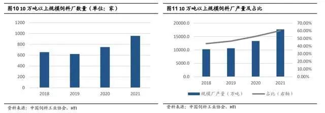 根据饲料工业协会的数据显示,2021 年全国 10 万吨以上规模饲料生产厂 957 家,比上年增加 208 家;合计饲料产量 17707.7 万吨,比上年增长 24.4%,在全国饲料总产量中的占比为 60.3%,比上年提高 7.5 个百分点。