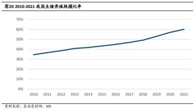 根据农业农村部的数据,我国 2021 年生猪养殖规模化率(年出栏 500 头以上规模养殖场户占比)首次达到 60%,同比增长 7pct。