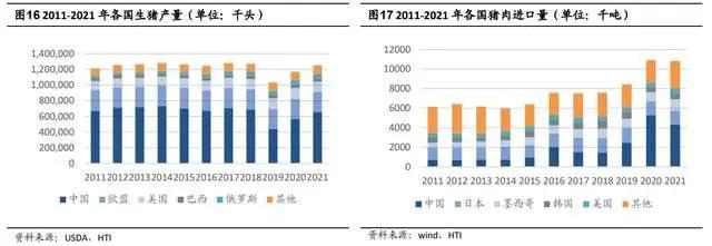 从 USDA 公布的进出口数据来看,我国的进口体量同样排名第一,尤其是在 2018 年开始,受到非洲猪瘟的影响,我国的猪肉产量出现了一定的不足,导致进口需求量进一步提升,2021 年有所回落,为 4330 千吨,领先第二名日本的 1420 千吨和第三名墨西哥的 1155 千吨。