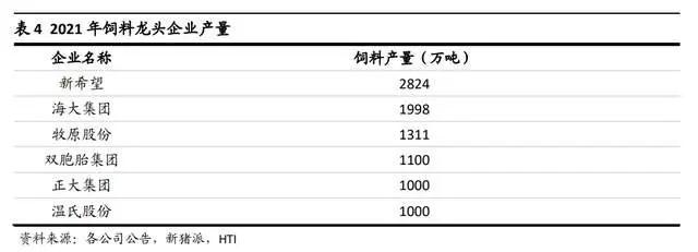 2021 年,行业共有 6 家企业饲料产量超千万吨,分别是新希望六和、海大集团、牧原股份、双胞胎集团、正大集团以及温氏集团,这些企业的产量占比达到 31%。其中牧原、温氏的饲料生产主要为自用。