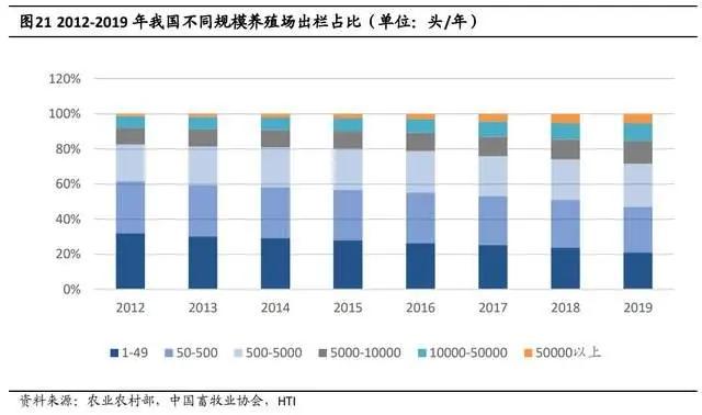 拆分来看,年出栏量在 1-49 头的非规模养殖户出栏量占整体出栏量的比例在逐年减少,从 2012 年的 32%下降到 2019 年的 21%;出栏量 50-500 头的占比也从 30%下降到 26%。出栏量 50000 头以上的养殖场出栏量稳步提升,从 2012 年的 1%提升到 2019 年 5%。