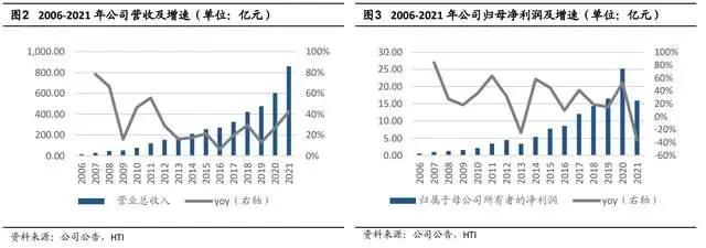 2006-2021 年,公司营业收入从 15.3 亿元增长至 860.0 亿元,CAGR 为 30.8%,归母净利润从 0.6 亿元提升至 16.0 亿元,CAGR 达到 25.0%。
